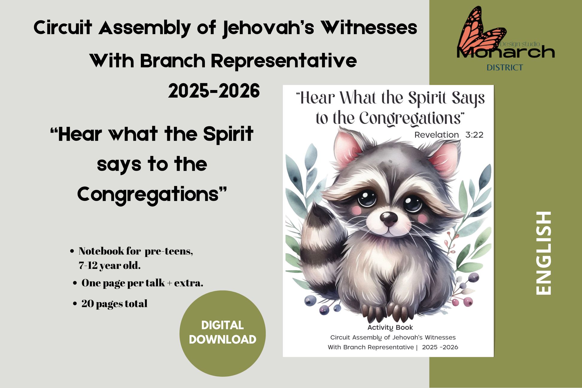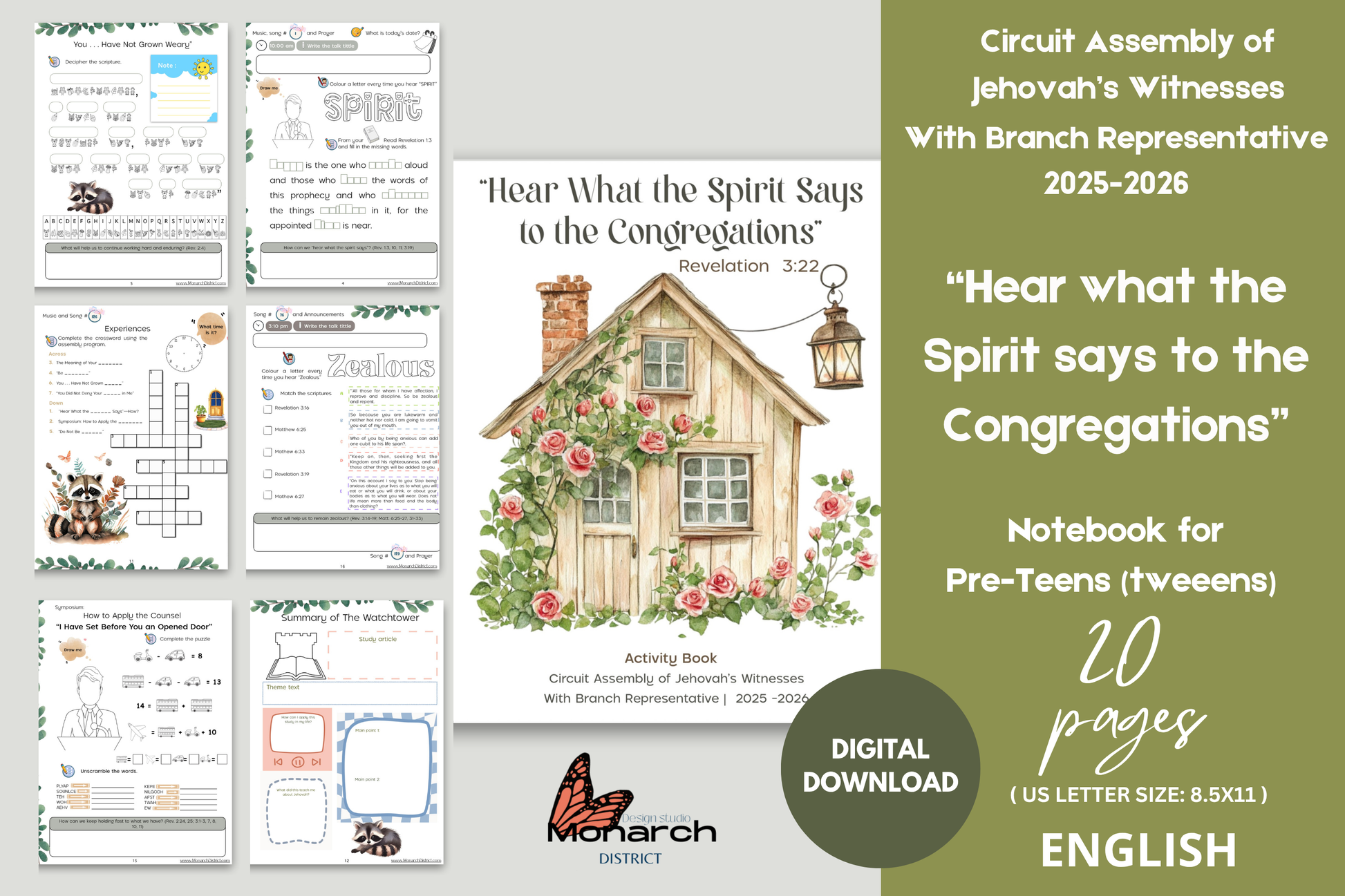 ENGLISH Tweens / pre-teens 7-12 years old activity book for the 2025-2026 Circuit Assembly with Branch Representative “HEAR WHAT THE SPIRIT SAYS TO THE CONGREGATIONS”. This activity book has been designed to help kids pay attention at the convention/assembly, learn to take notes, and keep them engaged. includes 20 pages total.