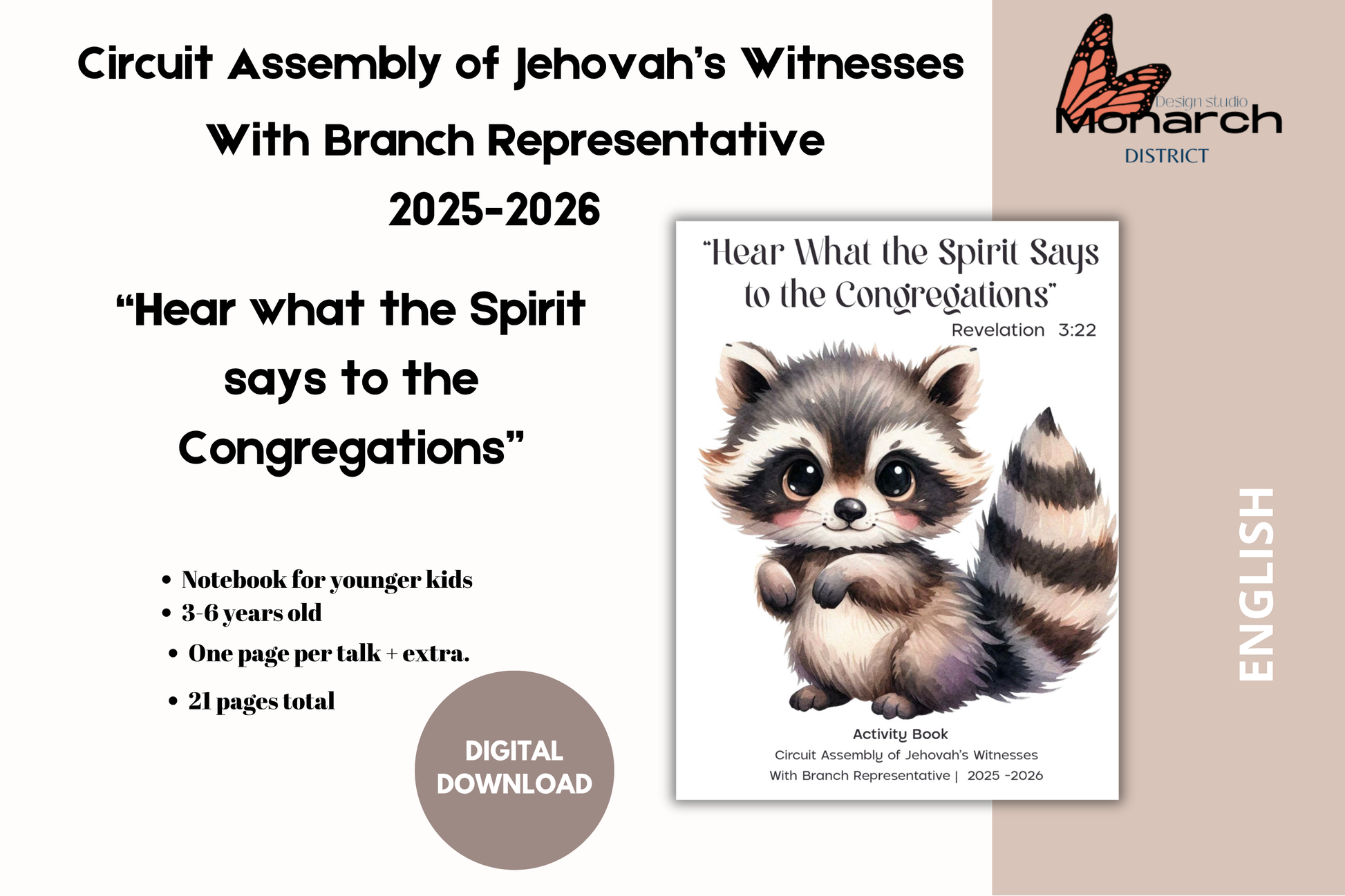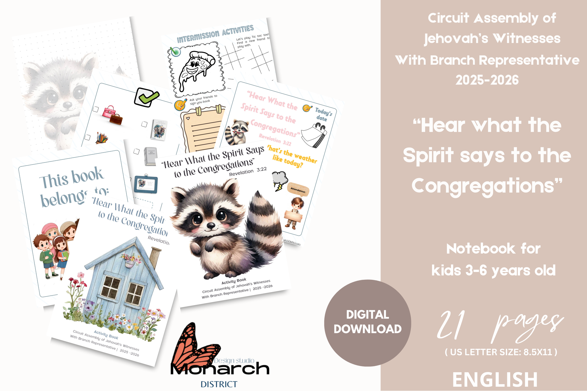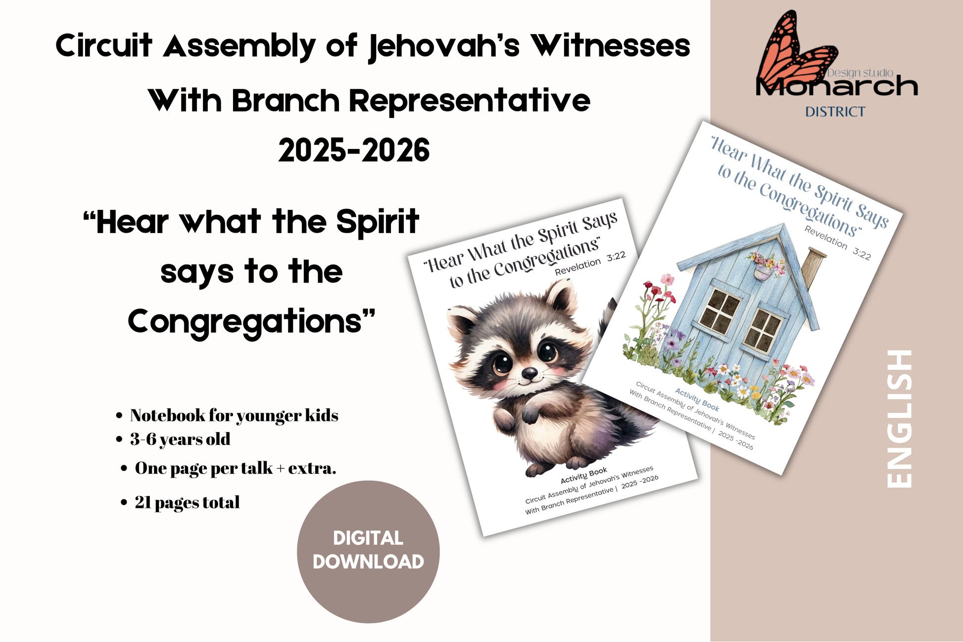 ENGLISH kids 3-6 years old activity book for the 2025-2026 Circuit Assembly with Branch Representative “HEAR WHAT THE SPIRIT SAYS TO THE CONGREGATIONS”. This activity book has been designed to help kids pay attention at the convention/assembly, learn to take notes, and keep them engaged. includes 21 pages total.