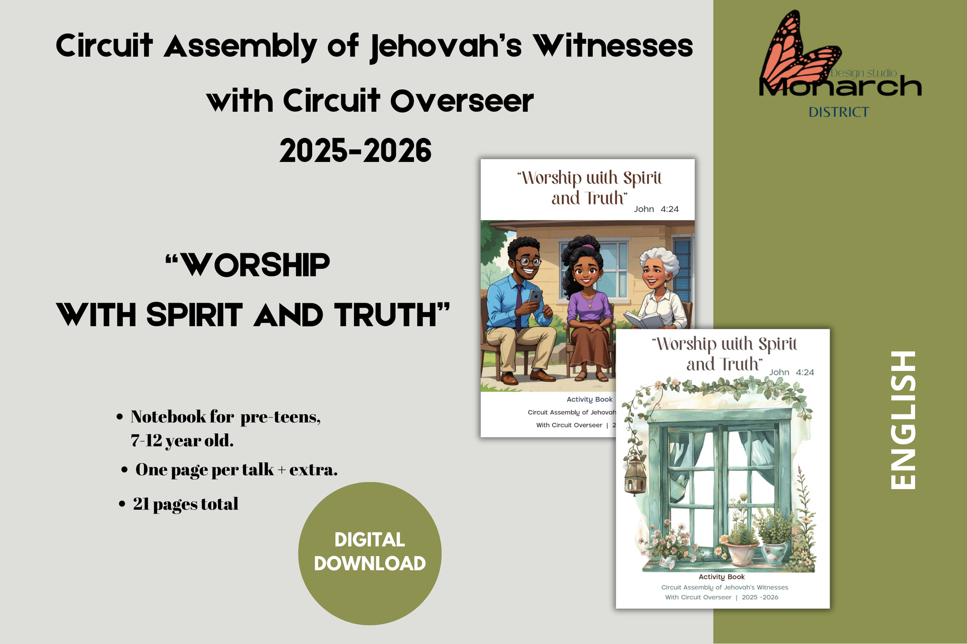 ENGLISH Tweens / pre-teens 7-12 years old activity book for the 2025-2026 Circuit Assembly “Worship with Spirit and Truth” with Circuit Overseer.