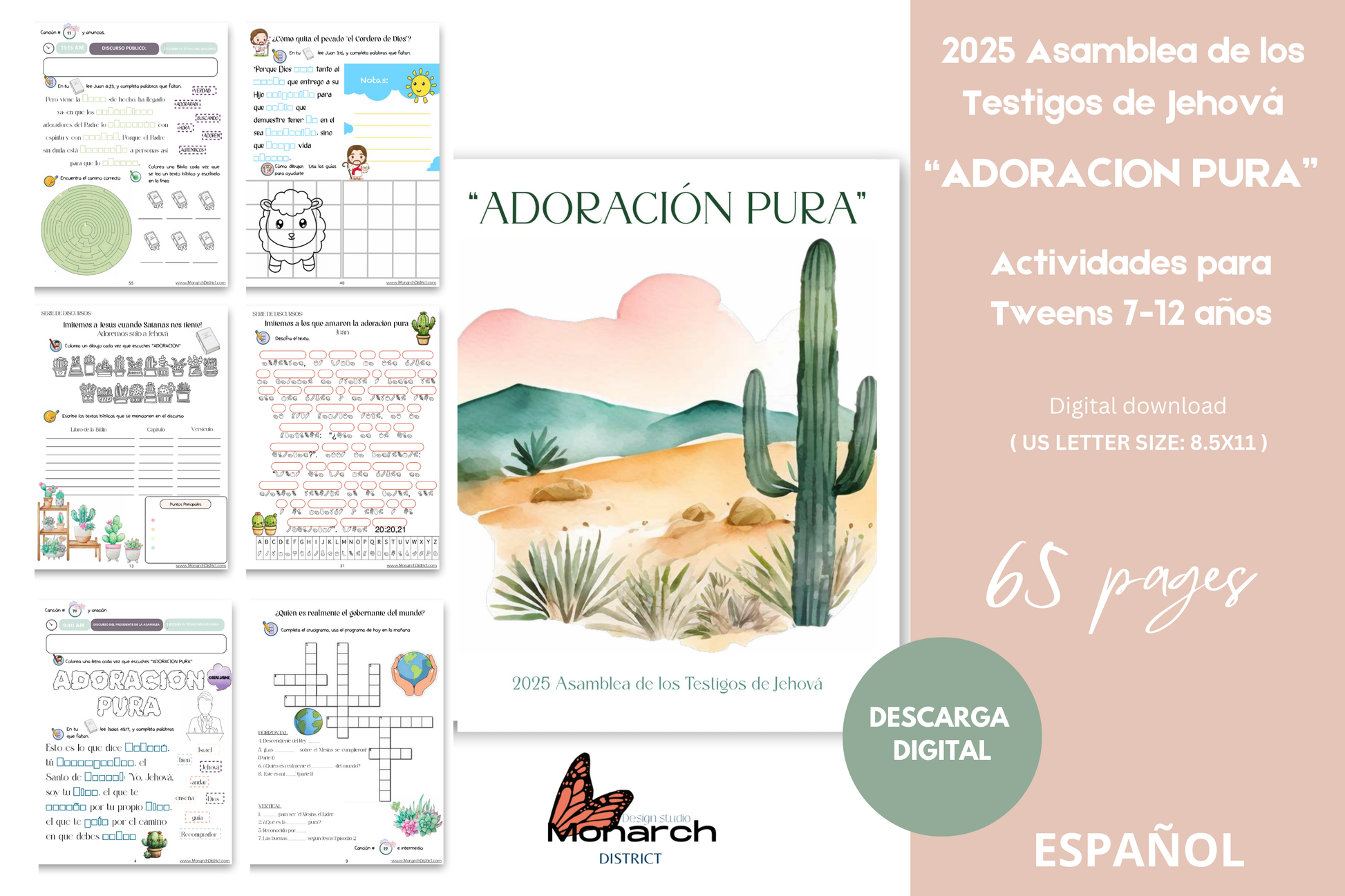 SPANISH JW Convention 2025 PURE WORSHIP, Digital Activity book for tweens 7-12 years old . This activity book has been designed to help kids pay attention at the convention/assembly, learn to take notes, and keep them engaged. includes 65 pages.